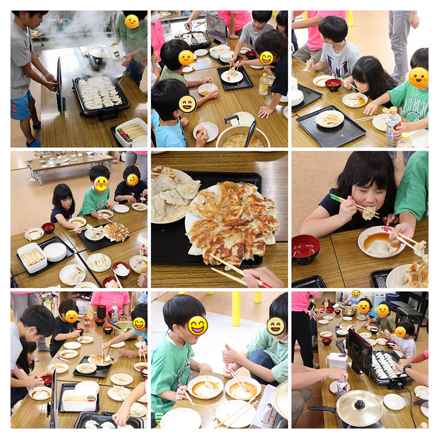 ホットプレートで焼き上げると、じゅわっと香ばしい匂いが広がり、「おなかすいた~!」という声があちこちから。焼きあがった餃子を口に入れると、パリッとした皮とジューシーな具が絶妙で、「おいしい!」「もっと食べたい!」と子どもたちは大喜び。自分で作った餃子はやはり特別な味わいだったようです。